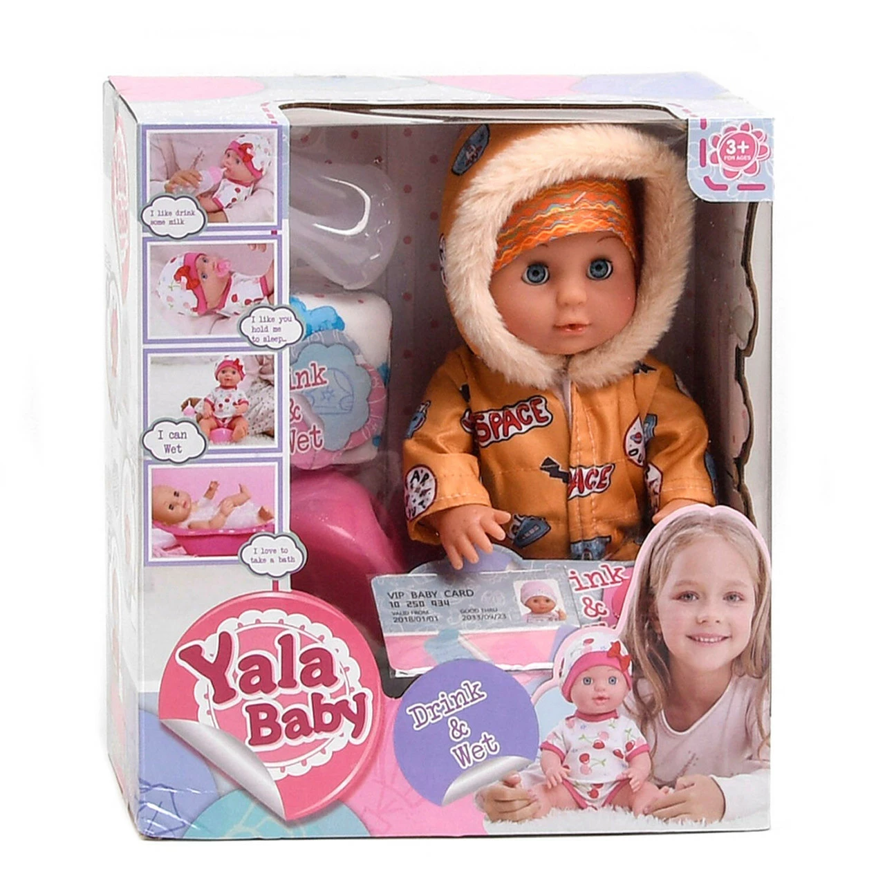 аксессуары. Для первичного ухода за младенцем набор комплектуется: бутылочкой, горшком, памперсом, соской и ID-картой. Рост пупса - 30 см.