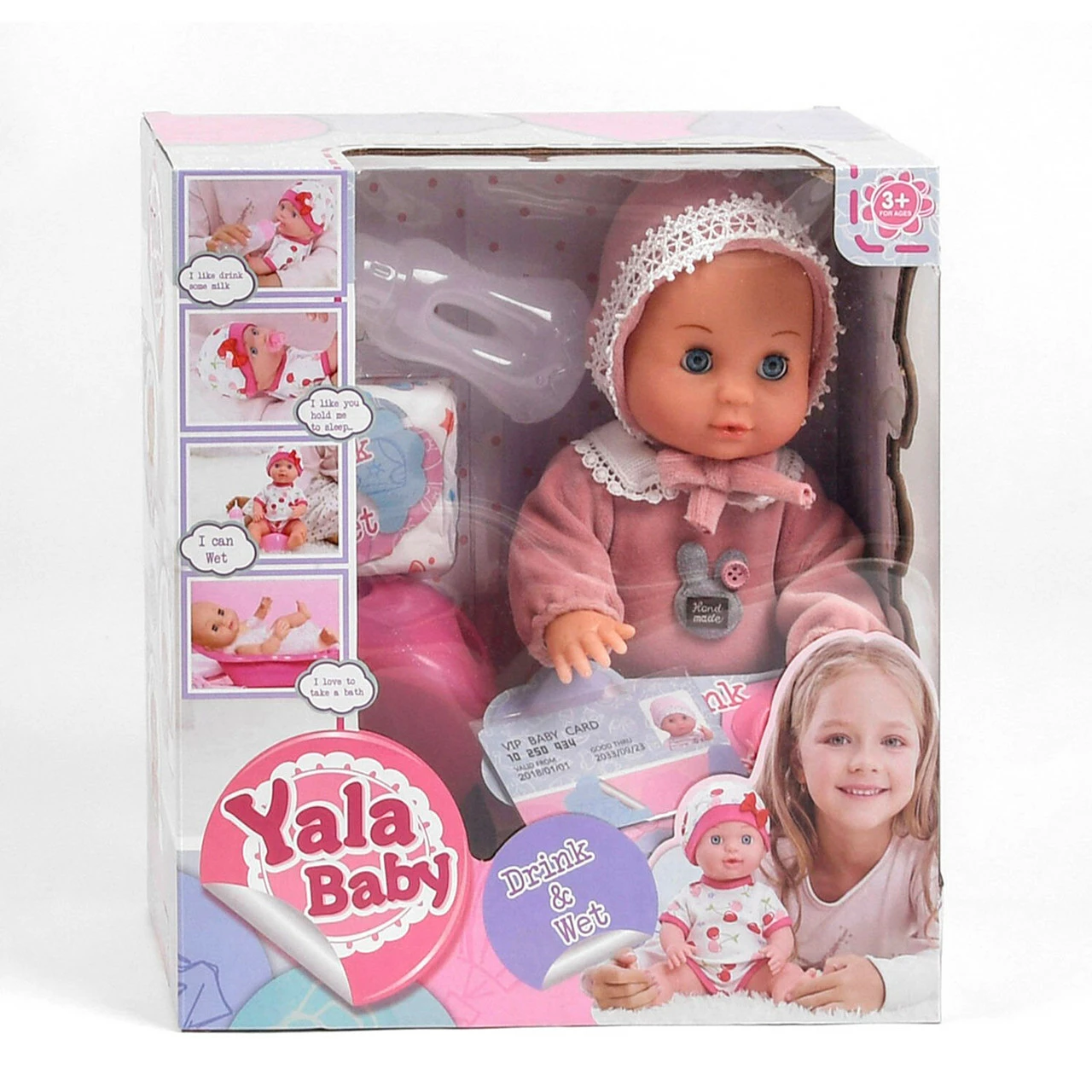 аксессуары. Для первичного ухода за младенцем набор комплектуется: бутылочкой, горшком, памперсом, соской и ID-картой. Рост пупса - 30 см.