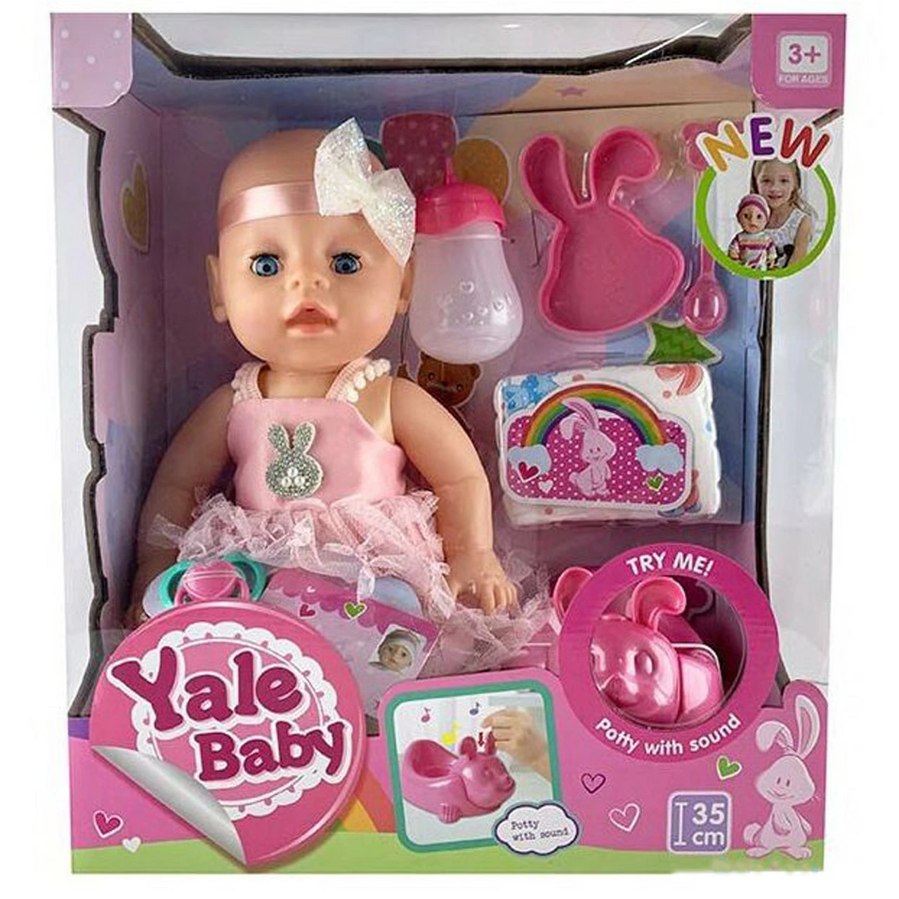 множество различных аксессуаров. Личико малыша выглядит живым и настоящим, благодаря качественной проработке всех деталей. Голубые выразительные глазки с черными пушистыми ресничками, аккуратный слегка приплюснутый носик и отлично детализированный приоткрытый ротик придают игрушке восторг и умиление. У очаровательного пупса анатомически правильное строение тела, округлый животик, подвижные ручки и ножки, небольшие бугорочки, а также отлично прорисованные пальчики с маленькими ноготочками. Малышка одета в нарядный розовый сарафан с красивой повязочкой на голове. Функциональный пупс умеет ходить на горшок, закрывать глазки и кушать из бутылочки. Аккуратное выполнение каждой детали и многофункциональность игрушки, делают данную модель поистине идеальным подарком для каждого ребенка. Для первоначального ухода за малышом в набор входит множество необходимых аксессуаров: