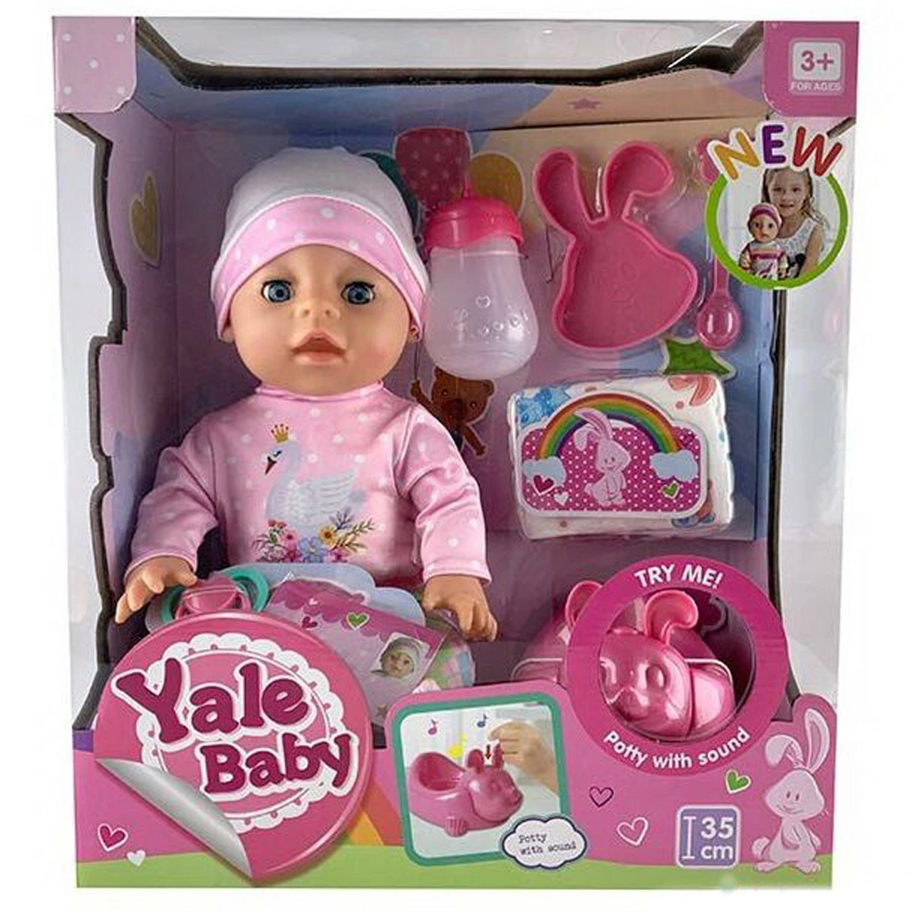 множество различных аксессуаров. Личико малыша выглядит живым и настоящим, благодаря качественной проработке всех деталей. Голубые выразительные глазки с черными пушистыми ресничками, аккуратный слегка приплюснутый носик и отлично детализированный приоткрытый ротик придают игрушке восторг и умиление. У очаровательного пупса анатомически правильное строение тела, округлый животик, подвижные ручки и ножки, небольшие бугорочки, а также отлично прорисованные пальчики с маленькими ноготочками. Малыш одет в розовый комбинезончик с тоненькой шапочкой в тон одежды. Функциональный пупс умеет ходить на горшок, закрывать глазки и кушать из бутылочки. Аккуратное выполнение каждой детали и многофункциональность игрушки, делают данную модель поистине идеальным подарком для каждого ребенка. Для первоначального ухода за малышом в набор входит множество необходимых аксессуаров: