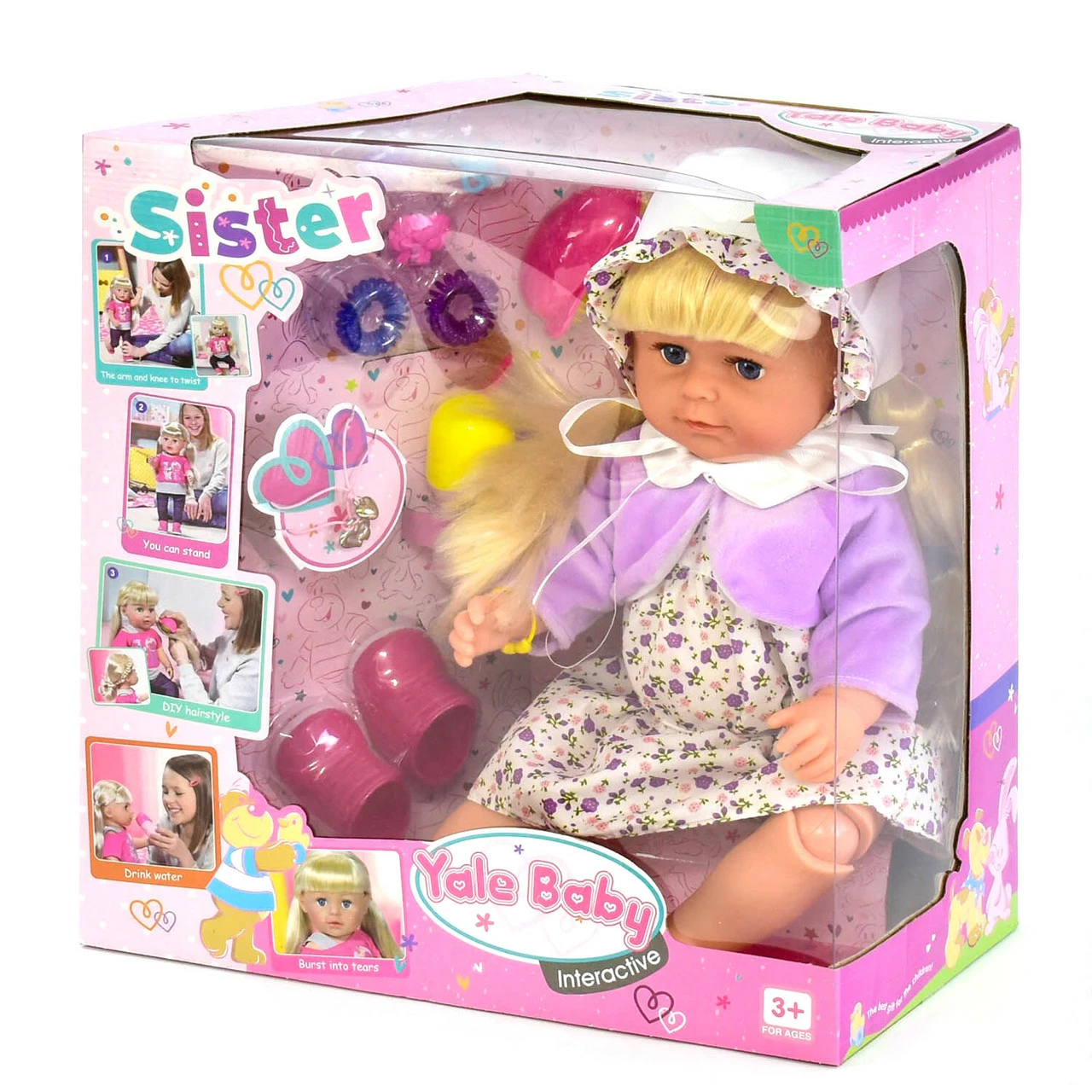 пупс запищит. В наборе с пупсом: бутылочка, щетка для расчесывания