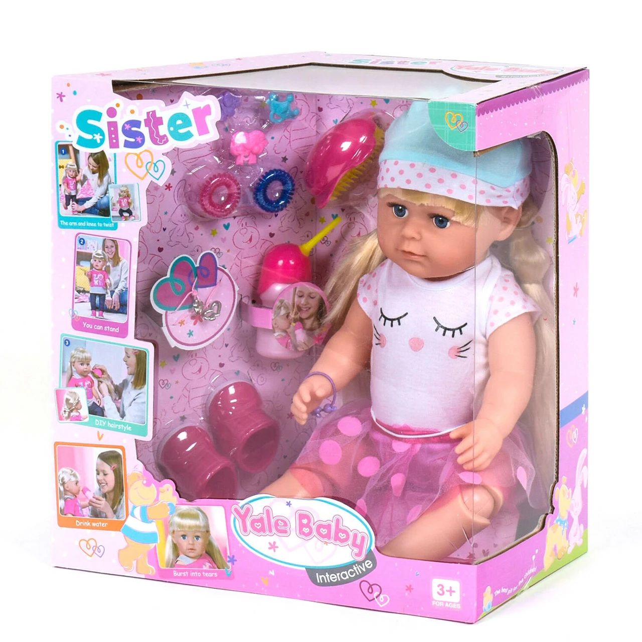пупс запищит. В наборе с пупсом: бутылочка, щетка для расчесывания