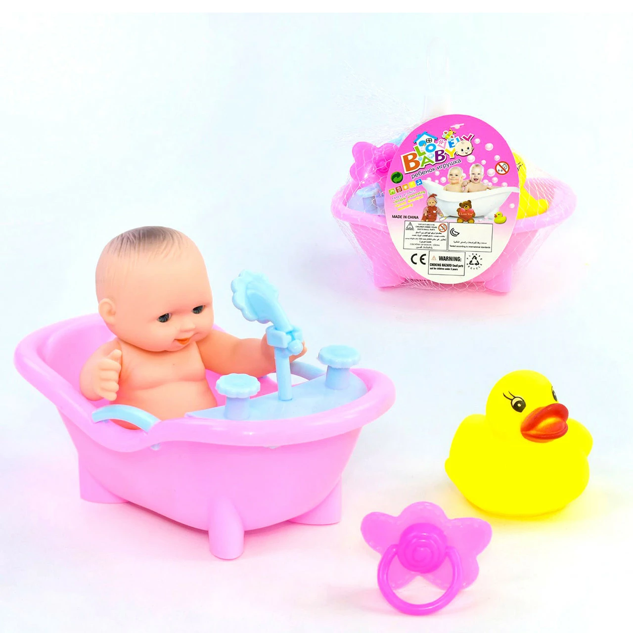 вместе с пупсом входит ванночка, пустышка и резиновая