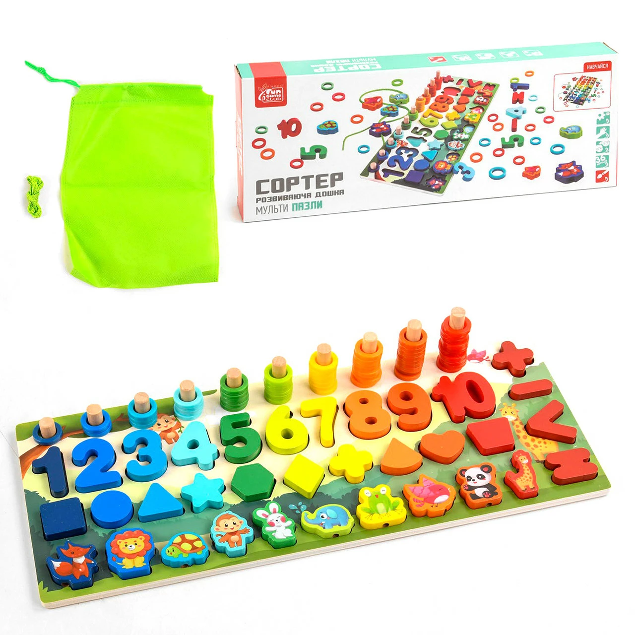 деревянная шнуровка. Благодаря данному обучающему набору малыш в наглядной игровой форме освоит навыки счета, выучит геометрические фигуры и названия различных животных и просто весело и с пользой проведет свой досуг. Все игровые элементы выполнены из качественной отшлифованной древесины и окрашены высококачественными яркими красками. Комплектация:
