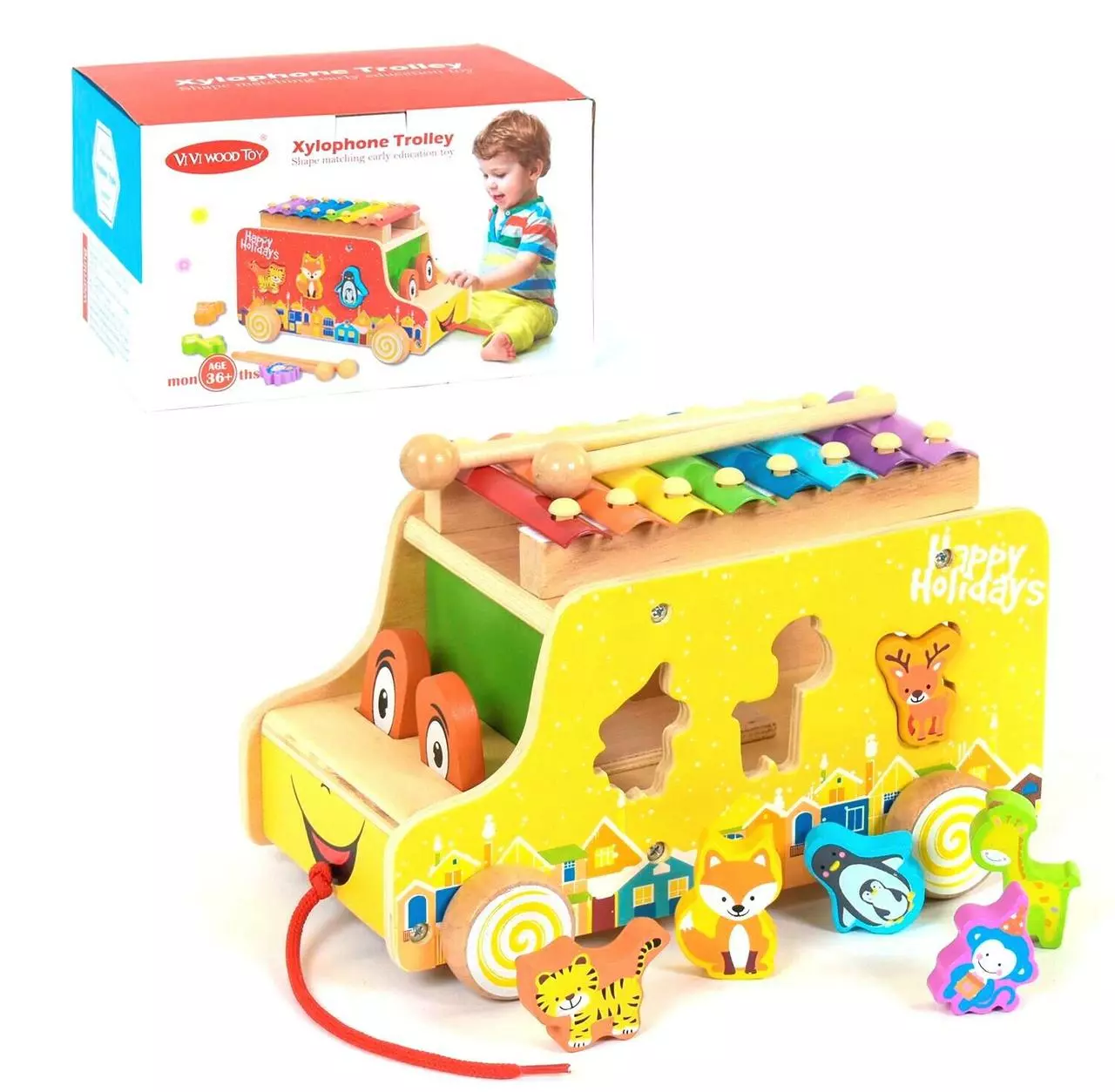 ксилофон . Колеса и шнурок позволят малышу использовать автобус в