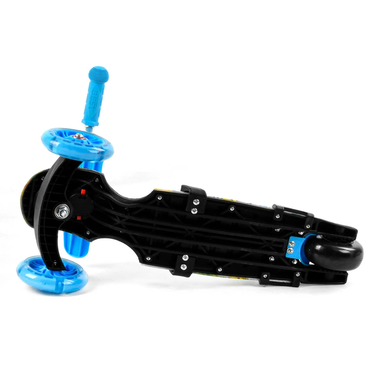 2 вида колес. Два передних светятся и изготовлены из полиуретана (PU), а заднее - из поливинилхлорида (пластика PVC); Размеры самоката: