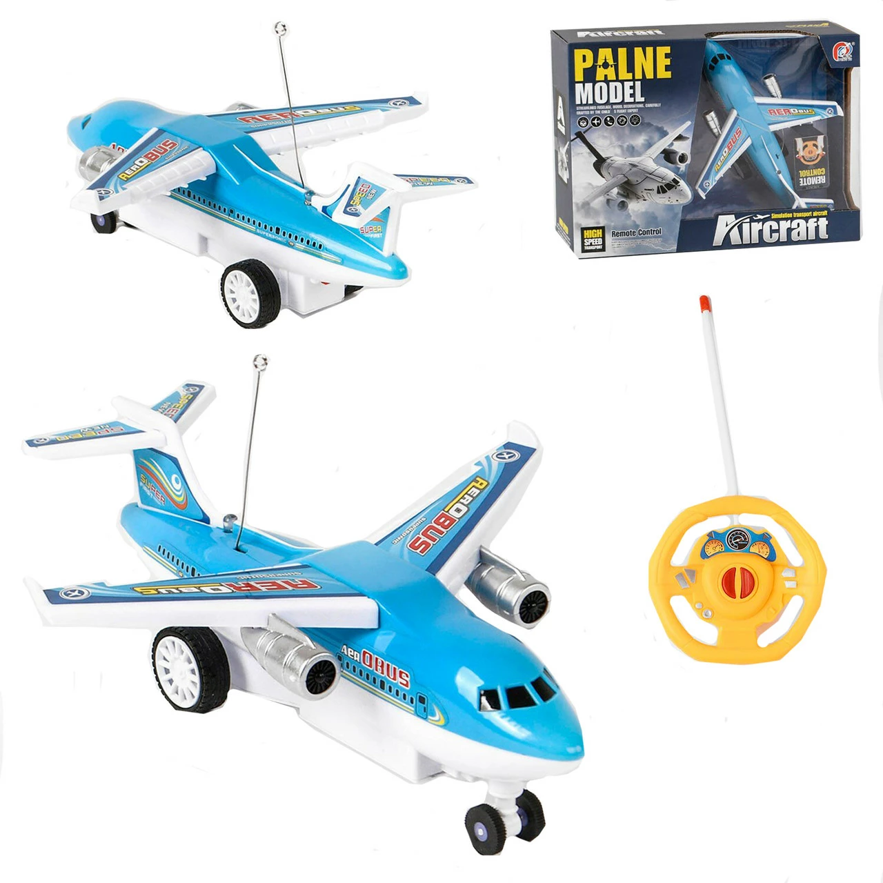 пульт работает от 2-х батареек типа AA (не входит в комплект). Современная модель самолёта обладает уникальным дизайном, который вмиг привлечёт внимание! Стильный транспорт окрашен в приятный голубой оттенок цвета неба и украшен наклейками по всему корпусу. При включении, на хвосте самолета загорается яркий свет, который не позволит потерять игрушку из вида. Аэроплан управляется с помощью пульта радиоуправления. С таким воздушным транспортом все высоты будут по плечу! Управление: