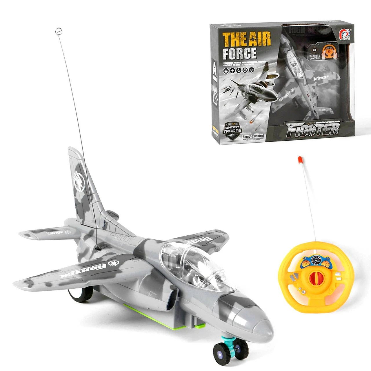 пульт работает от 2-х батареек типа AA (не входит в комплект). Современная модель самолёта обладает уникальным военным дизайном, который вмиг привлечёт внимание любителя спецтехники! Стильный транспорт окрашен в камуфляжные цвета и украшен наклейками по всему корпусу. При включении, кабина летчика загорается ярким светом, который не позволит потерять игрушку из вида. Аэроплан управляется с помощью пульта радиоуправления. С таким воздушным транспортом все высоты будут по плечу! Управление: