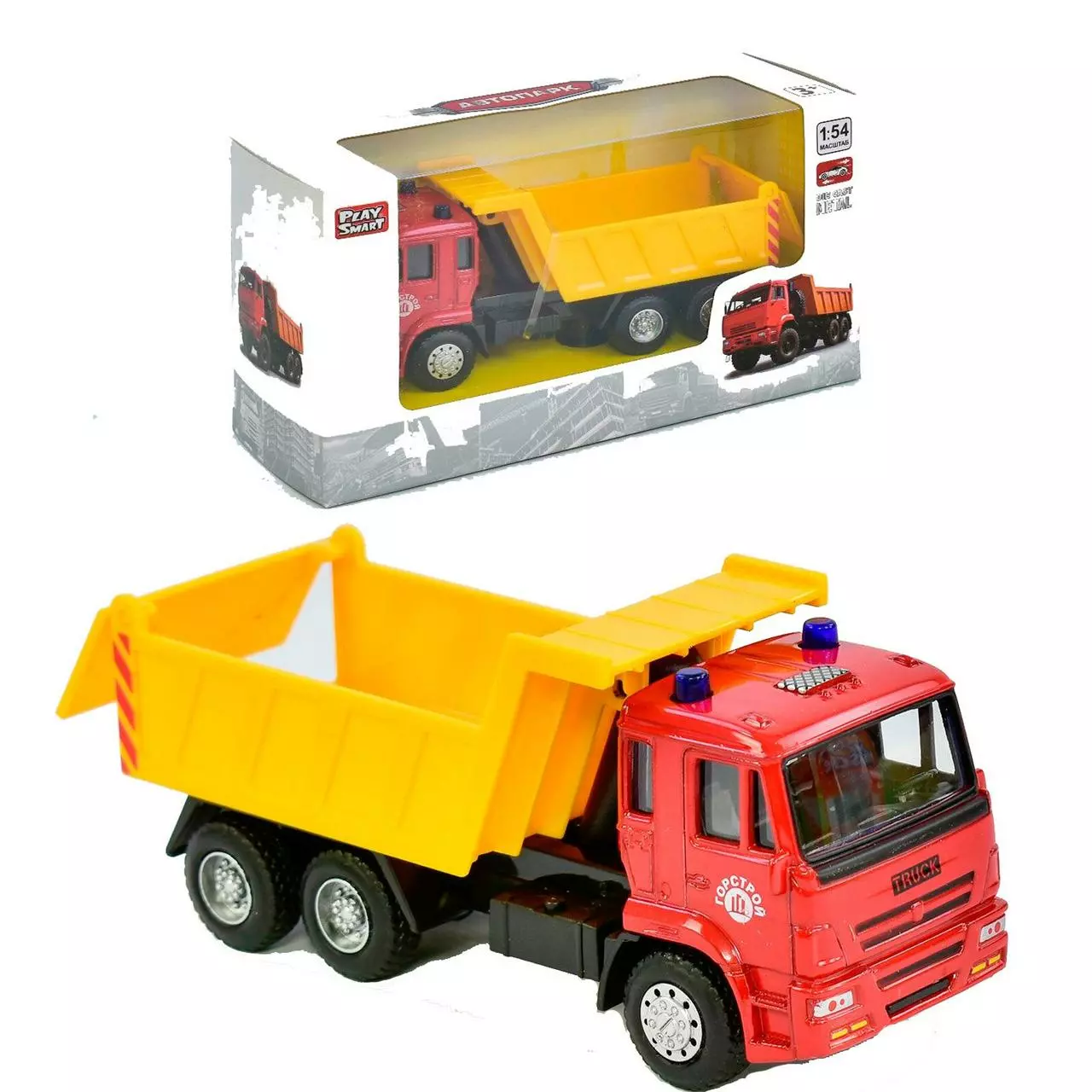 - кузов самосвала поднимается, откидывается задний борт. Металлический корпус, наличие инерционного механизма и подвижные элементы делают игрушку невероятно увлекательной и функциональной в процессе игры.