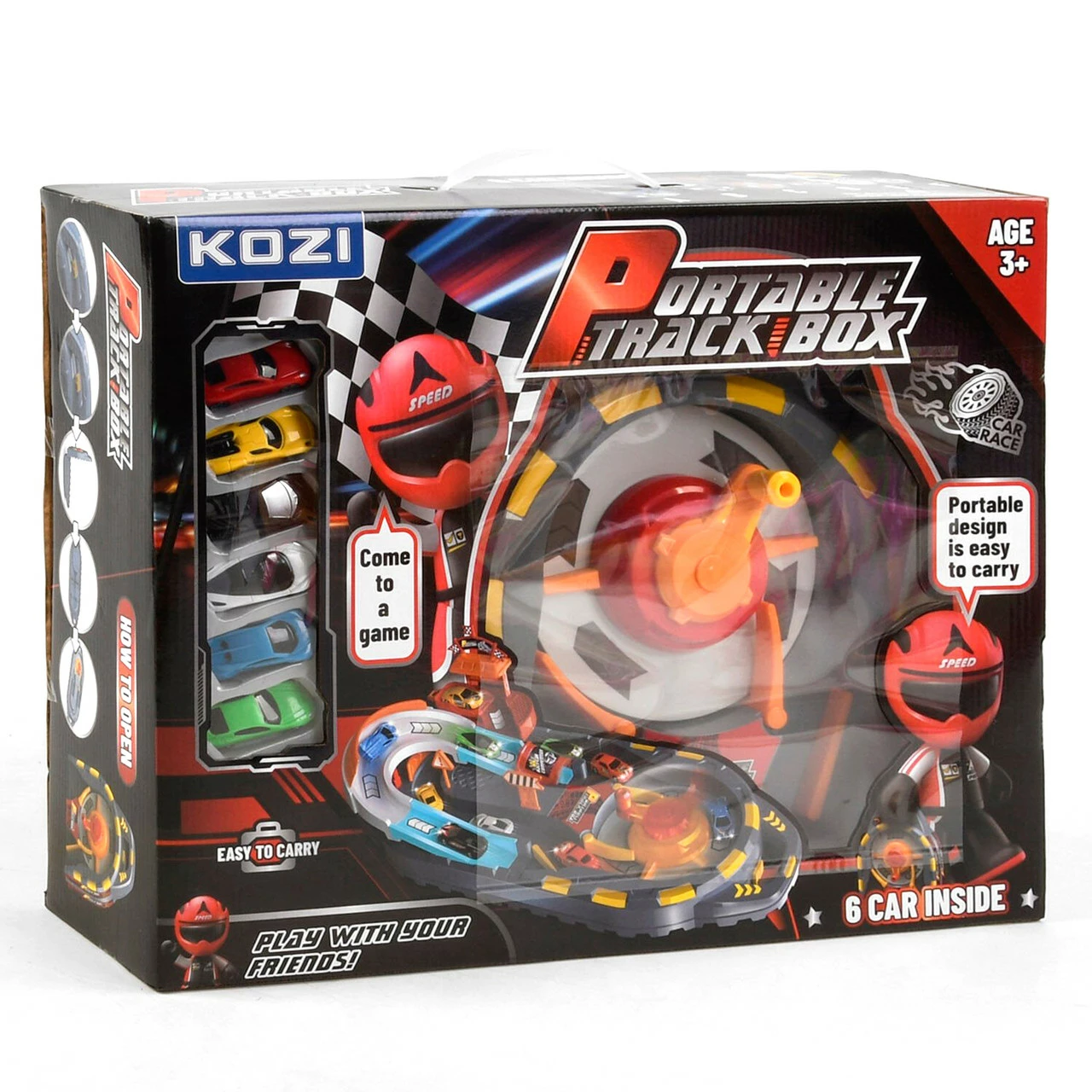 сторона - вращающаяся платформа, которая приводится в движение путем механического вращения рычага. У платформы есть один вход, что принимает поочередно машинки и один выход; сторона - экстремальная трасса, которая оборудована съёмным, полукруглым мостом и парковочной станцией. Под мостом проходит встроенная трасса с крутым разворотом и выходом на вращающуюся платформу. Автотрек дополнен несколькими дорожными знаками и большим листом с наклейками, чтобы автолюбитель смог сам создать фирменный дизайн кольцевой и очень крутой трассе. В набор входит 6 различных гоночных машинок, чтобы каждый заезд был захватывающим и непредсказуемым. Комплектация: