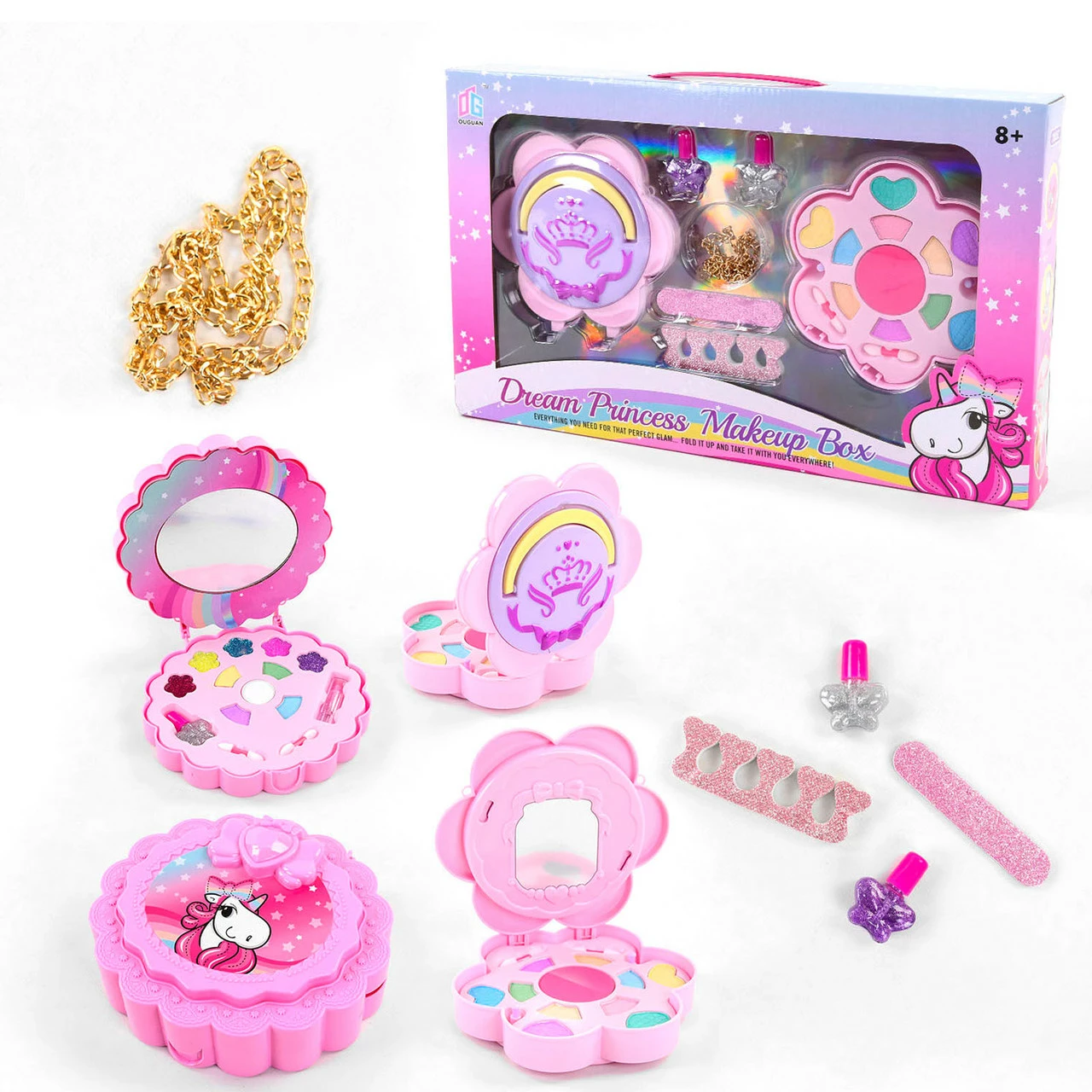 розовый цвет и включает в себя съемную крышку с ручкой и зеркалом.