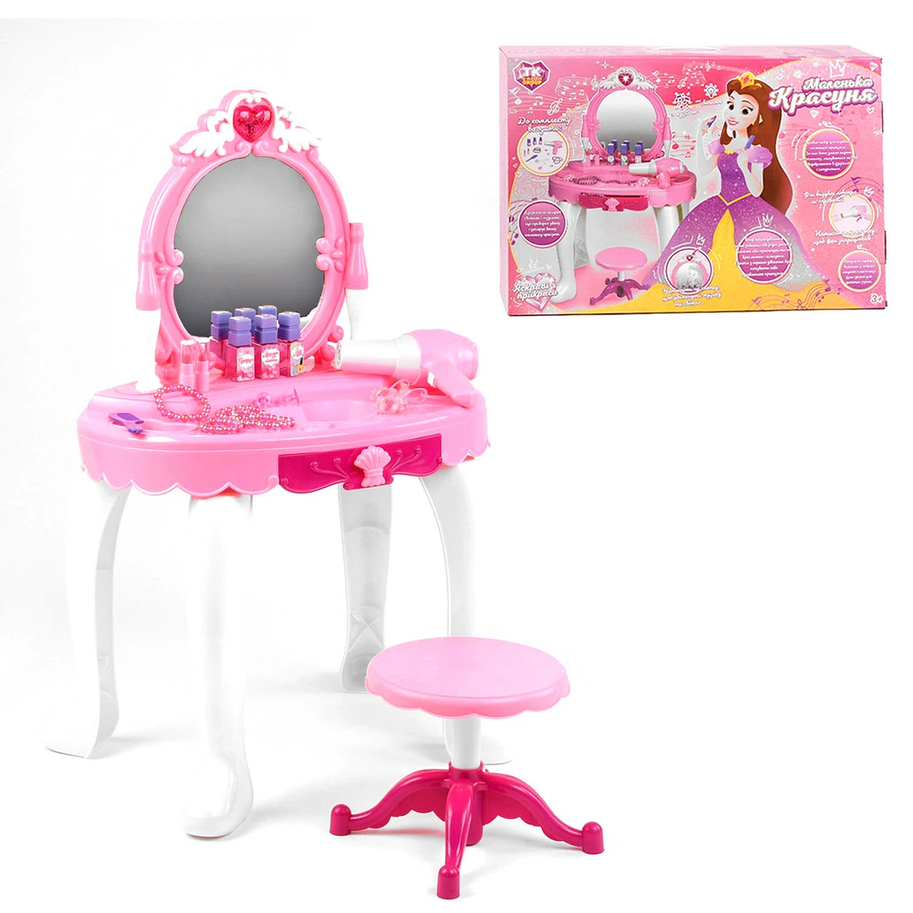 множество разнообразных аксессуаров. Туалетный столик оснащен зеркалом с фигурно обрамленной рамой, которая окрашена в нежный розовый цвет и украшено аккуратными декоративным растительными орнаментами. Приятным сюрпризом станет функциональная кнопка на зеркале в виде сердечка, которая воспроизводит волшебный звук и активирует яркую, мерцающую подсветку. Столешница с выдвижным ящиком и вылитыми фигурными шкатулочками обеспечат много свободного места для косметики и самых модных и необходимых аксессуаров. Большое игровое трюмо дополнено удобным стульчиком, стильными аксессуарами и муляжной косметикой. Каждый предмет игровой мебели изготовлен из безопасных материалов высокого качества и обладает скругленными углами, обтекаемыми формами, что сделает сюжетно-ролевые игры не только увлекательными, но и безопасными для здоровья Вашей маленькой принцессы. Габариты столика в собранном виде - 45 х 34 х 72см. Габариты стульчика - 19 х 19 х 18 см. Комплектация:
