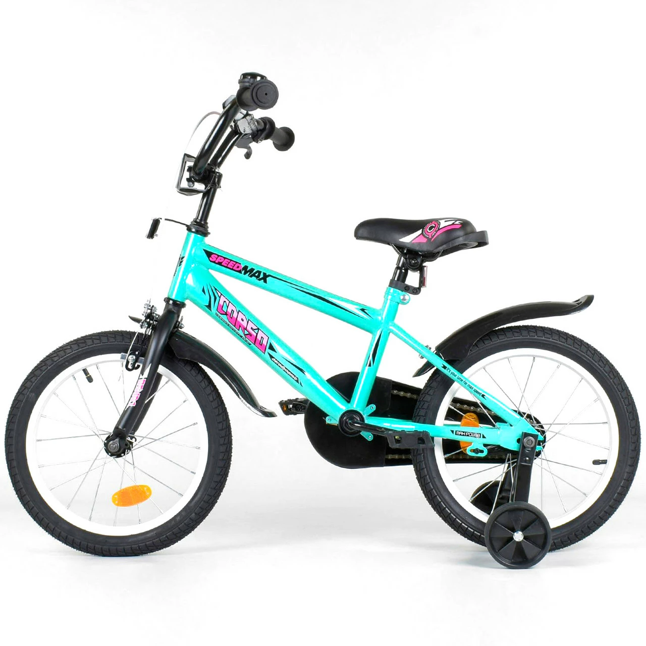 легкий вес; передний ручной тормоз и задний ножной тормоз; удобные качественные грипсы руля (резиновые ручки на руле); эксклюзивный дизайн CORSO ; уникальная матовая и глянцевая покраска; мягкое, комфортное сиденье; стальные противоударные диски 16 ; каретка: American (Американка); дополнительные боковые страховочные колеса; звоночек на руле. Безопасность во время катания обеспечат: пластиковый защитный щит на цепи велосипеда, мягкая накладка на его руле. Над каждым колесом установлены крылья из пластика. Они предотвратят разбрызгивания грязи и воды и защитят ребенка и сам велосипед от загрязнений. Велосипед собран на 75%; Масса Нетто: 10 кг