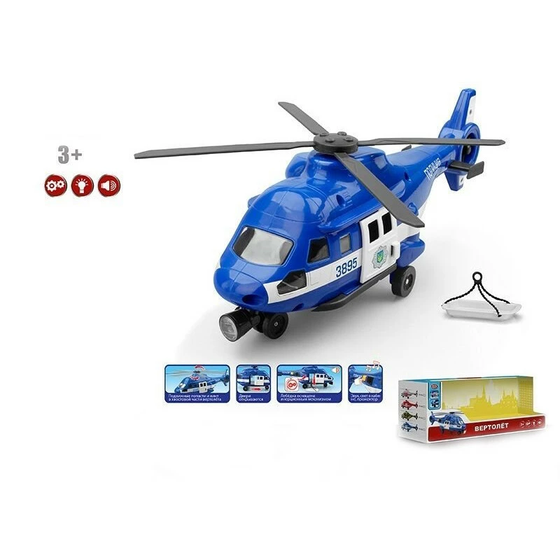 реалистичные звуки вертолета - звуки винта и сигнал. Размер вертолета - 35 10 15 см. Эффекты работают от 3-х батареек АА - не входят в комплект.